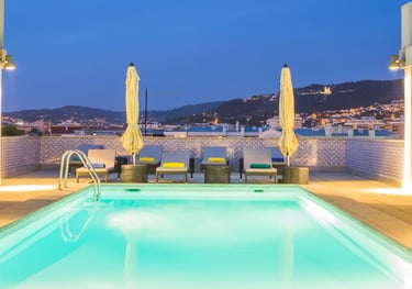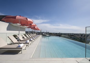 This stylish hotel offers a refined urban escape, highlighted by a stunning rooftop pool that overlooks the city and surrounding hills. By day, the terrace is a sun-filled retreat with comfortable loungers and elegant umbrellas; by night, it transforms into a serene oasis, where soft lighting reflects off the water and city lights sparkle in the distance.
