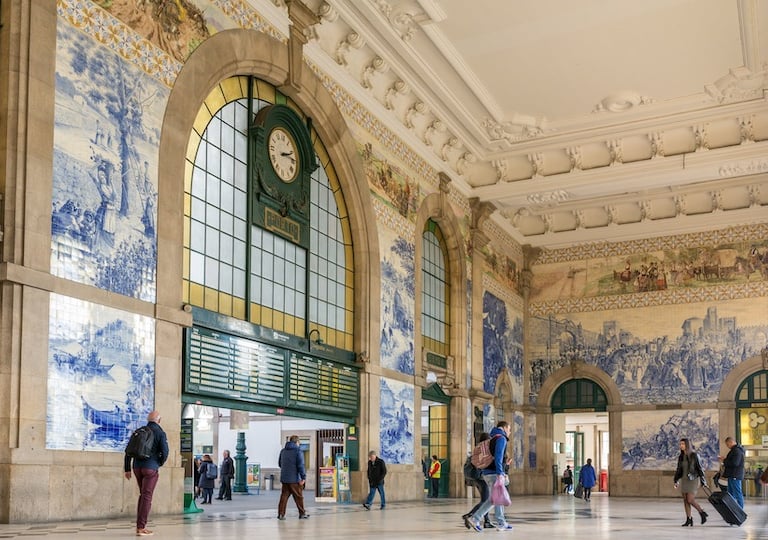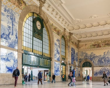 The grand entrance hall of the station is breathtaking, with intricate blue and white tile panels that depict scenes from Portuguese life, battles, and transportation. These hand-painted tiles from the early 20th century create a captivating visual narrative that takes visitors back in time.